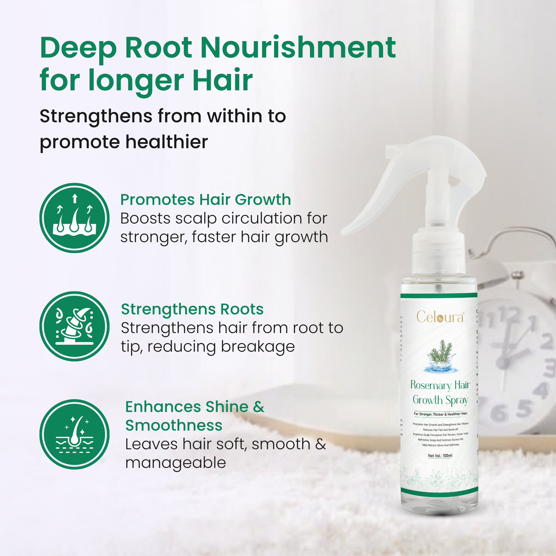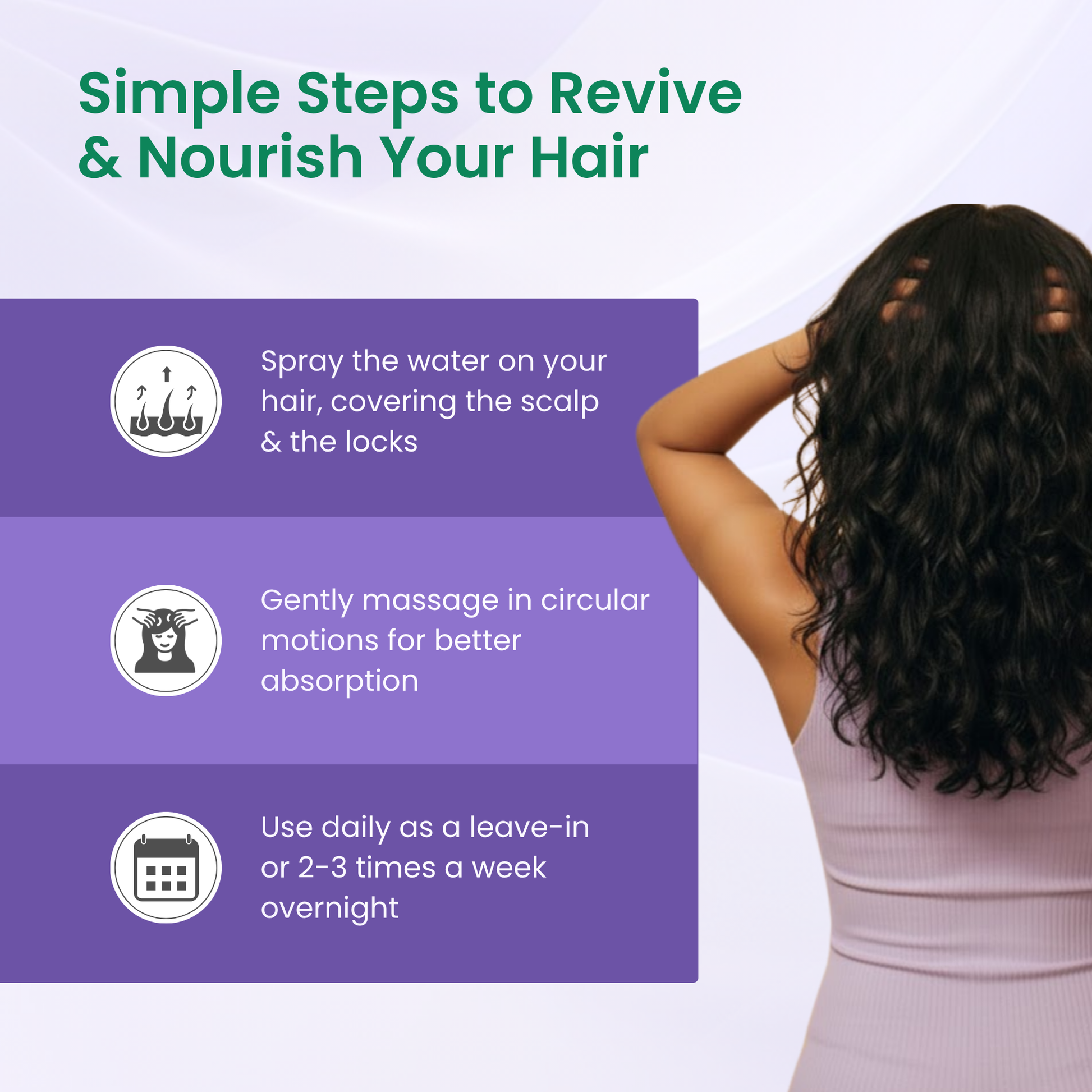 Spray directly onto scalp and hair roots. Gently massage in circular motions for better absorption. Use daily as a leave-in treatment or 2–3 times weekly overnight for best results.